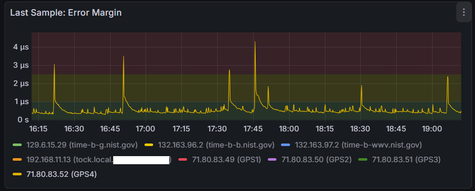 As shown in the Error Margin graph, COM1 (red) hangs out around 2us precision, COM2 (purple) sticks around 200 ns and occasionally spikes to over 1 us, COM3 (green) is all over the place between 2 us and 150 ns, and COM4 (yellow) holds steady around 500 ns.